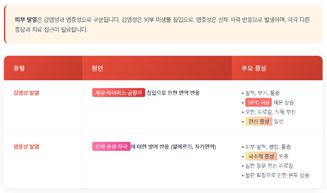 피부 발열은 다양한 원인으로 발생할 수 있으며, 감염이나 염증 반응과 관련이 깊습니다. 이러한 증상은 자칫 큰 문제로 이어질 수 있으므로, 적절한 구별이 필요합니다. 적절한 대응을 위해서는 피부 발열이 감염성인지 염증성인지 확인하는 것이 중요합니다. 이 글에서는 피부 발열의 원인과 감염 및 염증 반응의 차이를 자세히 알아보겠습니다. 관련된 주요 정보들을 하나씩 살펴보겠습니다.