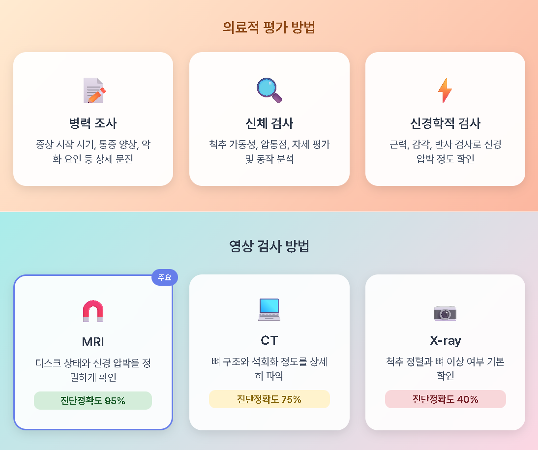 의료적 평가 후에는 영상 진단이 필요할 수 있습니다. 일반적으로 MRI(자기공명영상)가 사용되며, 디스크의 상태와 신경 압박 여부를 확인하는 데 유용합니다. 이러한 진단 과정을 통해 정확한 상태 파악이 가능합니다.