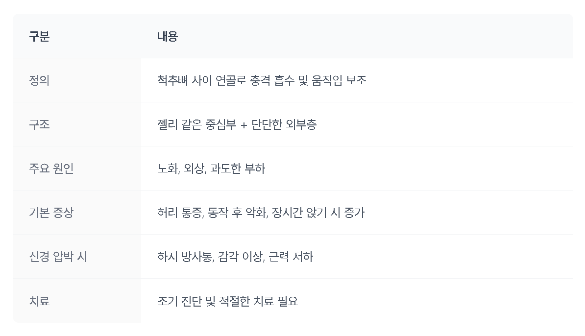 | 구조 | 척추 사이에 위치한 연골 구조 |