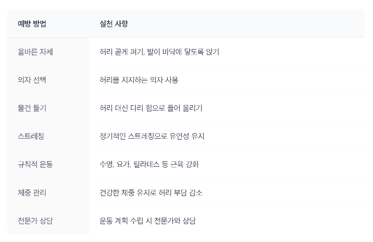 | 예방 방법 | 올바른 자세 | 규칙적인 운동 |
