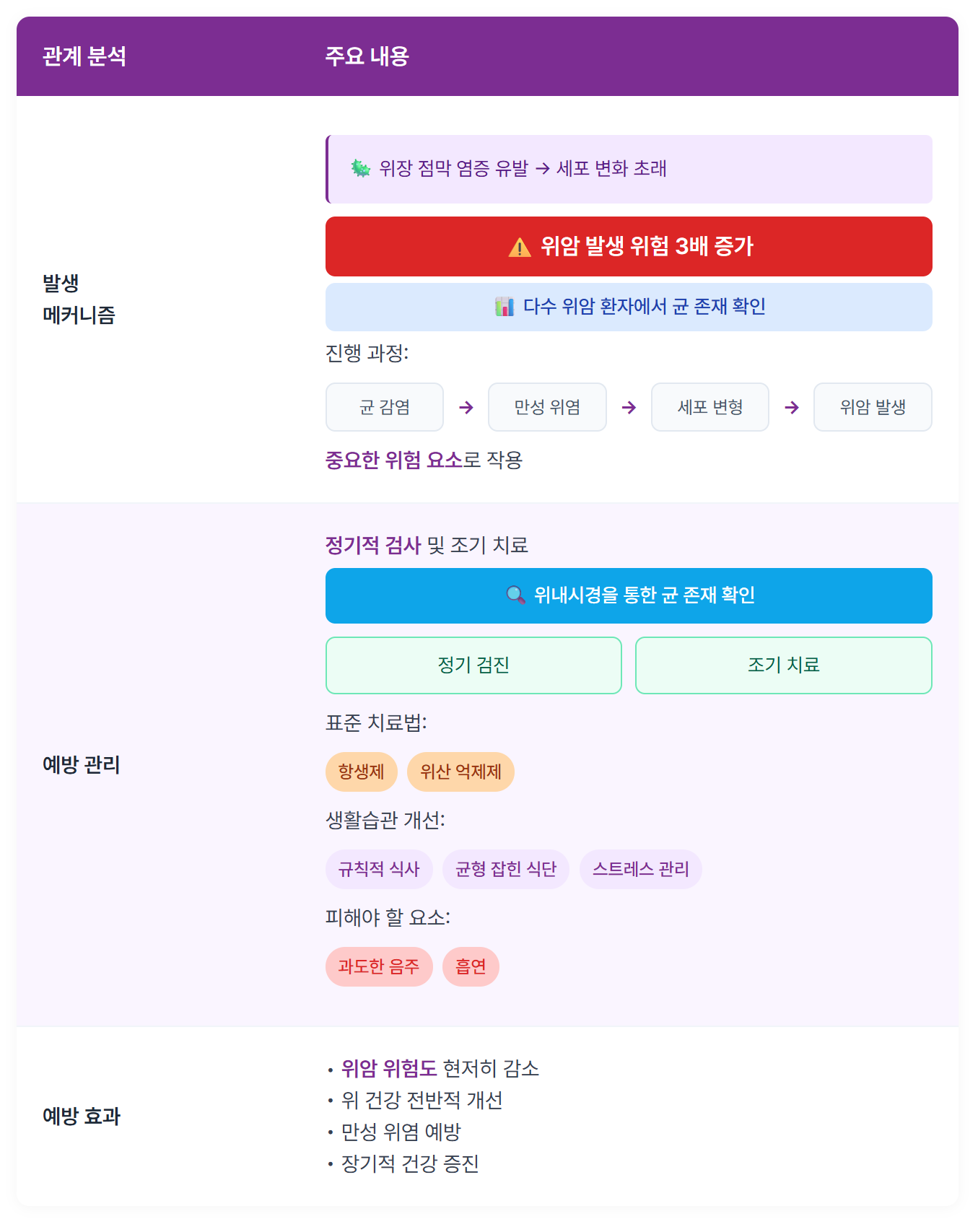 헬리코박터 파일로리 균은 위장 점막에 염증을 유발하고, 이로 인해 세포 변화를 초래할 수 있습니다. 연구에 따르면 이 균의 감염이 지속될 경우, 위암으로 발전할 수 있는 위험이 3배 증가한다고 보고되었습니다. 실제로, 많은 위암 환자에서 이 균의 존재가 확인되었습니다.