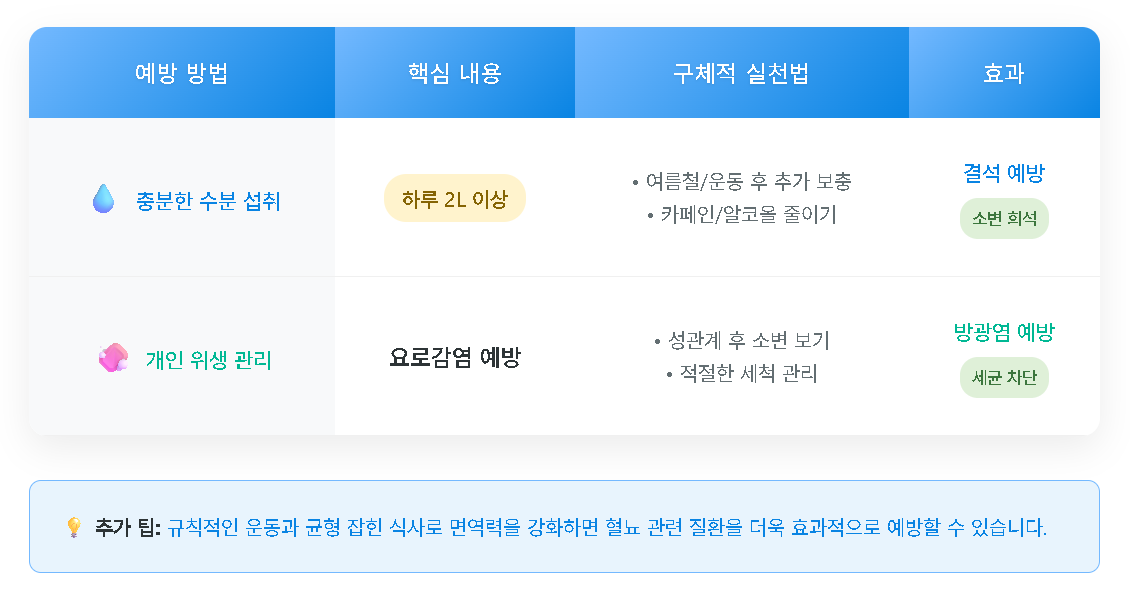 혈뇨를 예방하기 위해서는 충분한 수분 섭취가 필수적입니다. 체내 수분이 부족하면 소변이 농축되어 결석이 형성될 가능성이 높아집니다. 따라서, 하루에 적어도 2리터 이상의 수분을 섭취하는 것이 좋습니다.