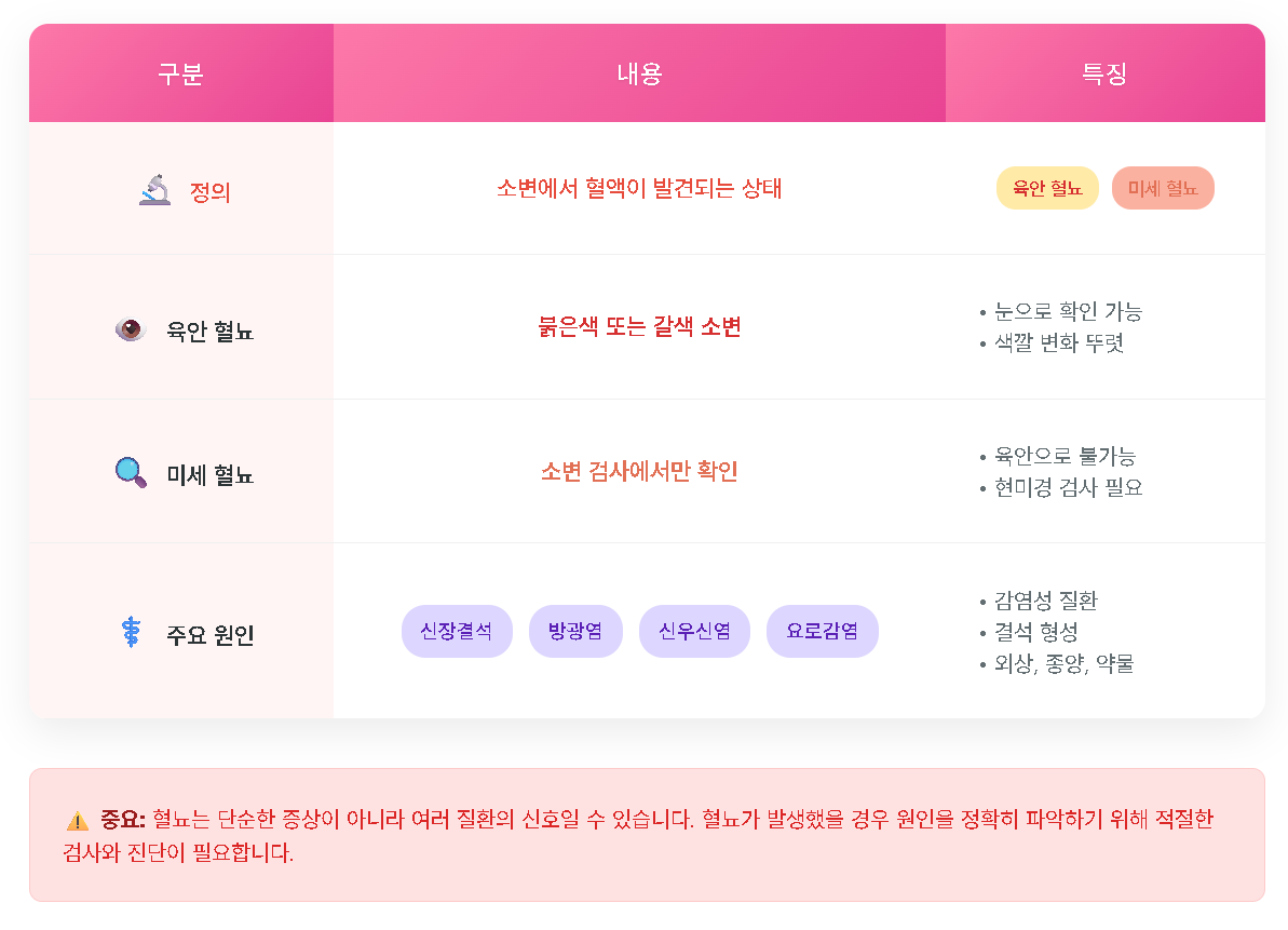 혈뇨는 소변에서 혈액이 발견되는 상태를 의미합니다. 이는 육안으로 확인할 수 있는 경우와 미세하게 존재하는 경우로 나뉩니다. 육안으로 보이는 혈뇨는 붉은 색 또는 갈색의 소변으로 나타나며, 미세혈뇨는 일반적인 소변 검사에서만 확인됩니다. 혈뇨는 감염, 결석, 외상 등 다양한 원인에 의해 발생할 수 있습니다.