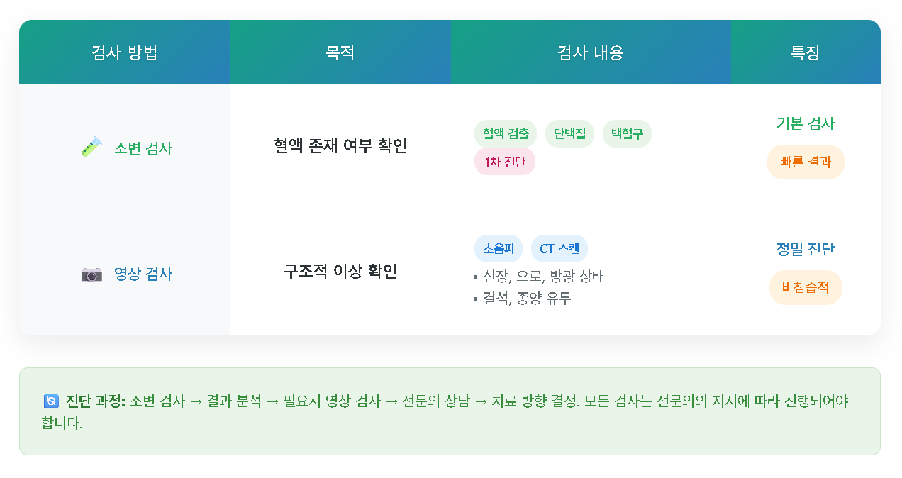 소변 검사 결과에 따라 추가적인 검사(초음파, CT 스캔 등)가 필요할 수 있습니다. 이는 혈뇨의 원인을 더욱 구체적으로 확인하고, 적절한 치료 방법을 결정하는 데 도움을 줍니다. 따라서, 혈뇨가 확인된 경우 전문의의 조언에 따라 검사를 진행해야 합니다.