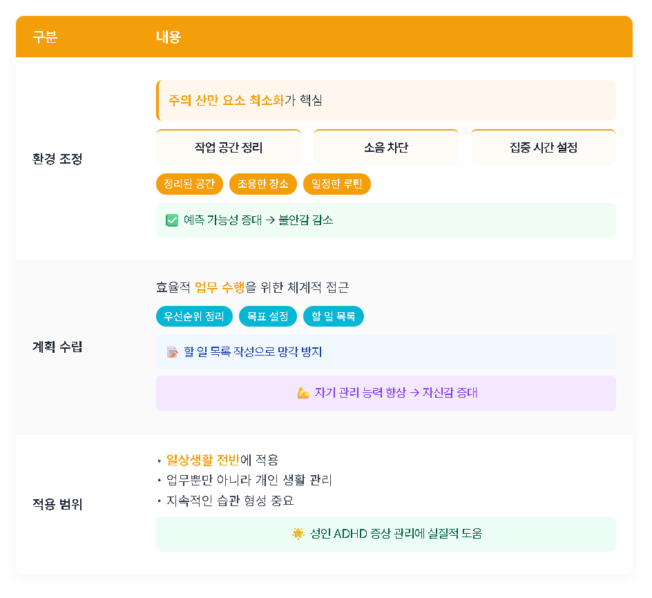 성인 ADHD를 관리하기 위해서는 환경 조정이 필요합니다. 작업 공간을 정리하고, 주의가 산만해지는 요소를 최소화하는 것이 중요합니다. 예를 들어, 소음이 적은 장소에서 작업하거나, 집중이 필요한 시간에 맞춰 작업하는 등의 방법이 있습니다.