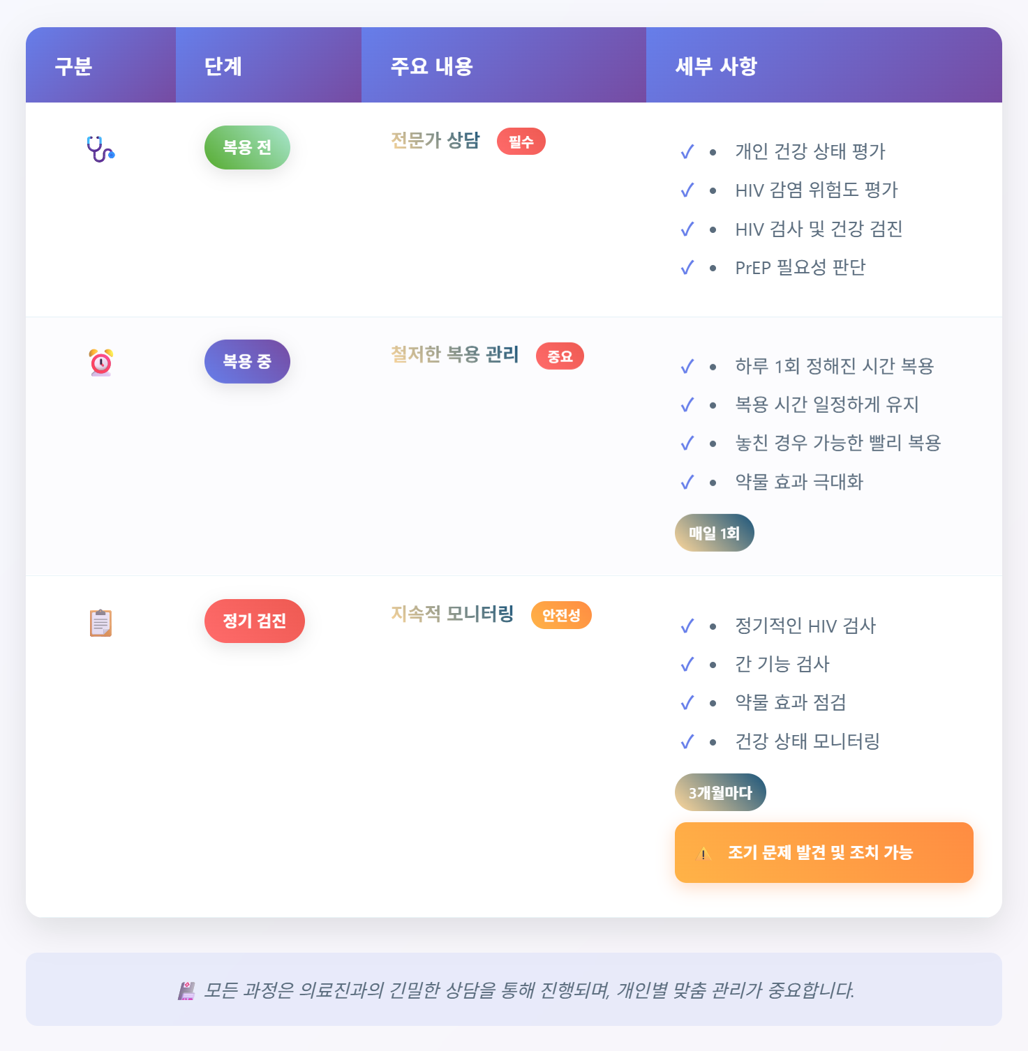 정기 검진은 PrEP의 안전성을 높이는 중요한 요소입니다. 의료진과의 상담을 통해 필요한 검사를 정기적으로 실시해야 합니다.